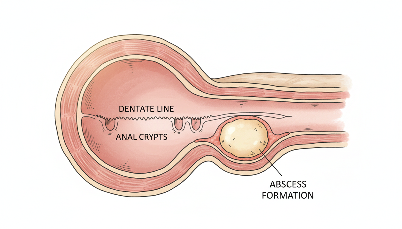 肛門と直腸の接合部には「歯状線」と呼ばれる境界があり、そこには小さなくぼみ(肛門陰窩)が存在します。このくぼみに便が入り込み、細菌感染が起こると、肛門腺という組織に炎症が広がります。炎症が進むと、肛門周囲の皮下組織にまで膿がたまり、肛門周囲膿瘍となります。
